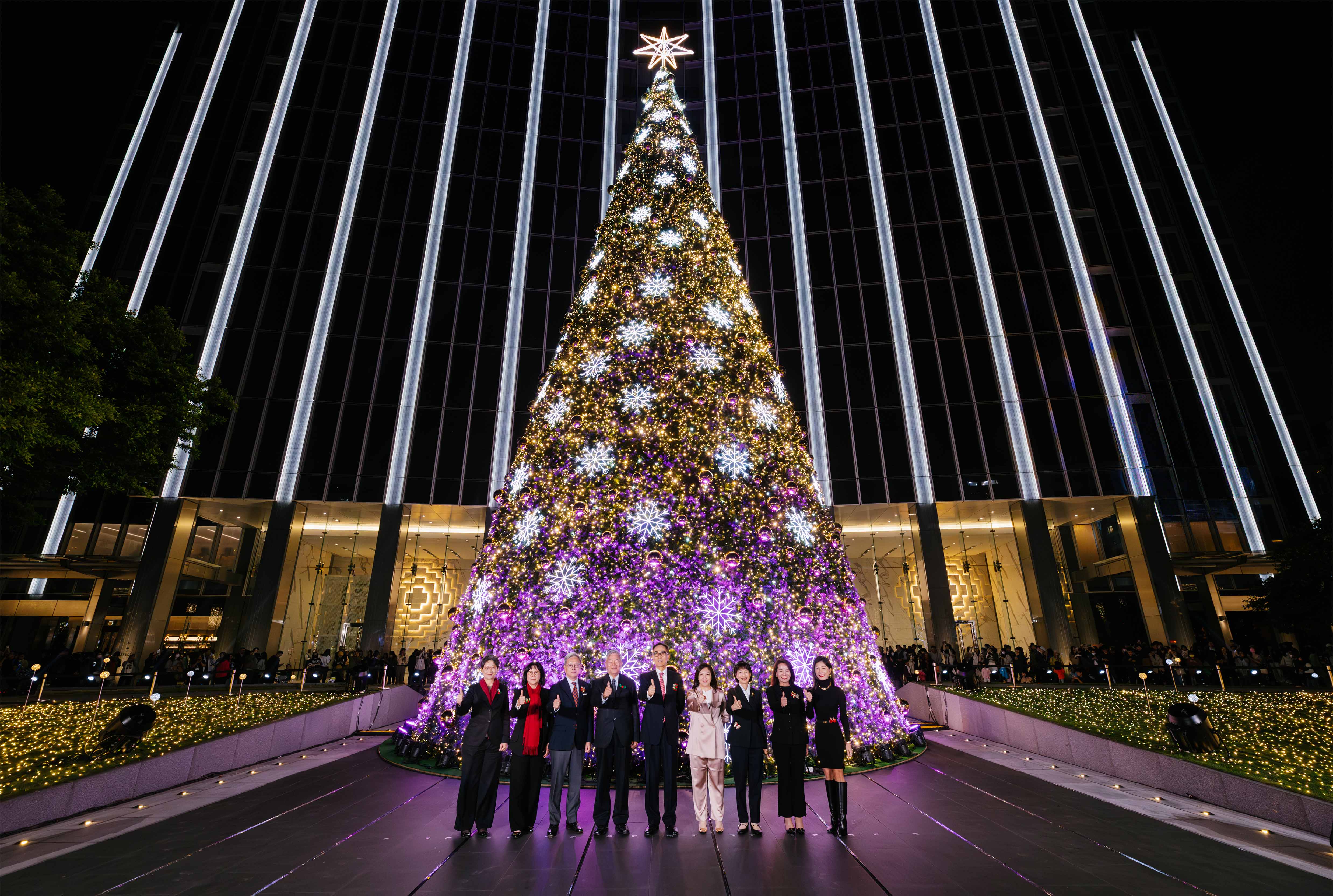 凱基金控今(28)日晚間在總部廣場舉行年度聖誕點燈活動,全台最高的飄雪聖誕樹正式亮相,絢麗光影搭配人造雪花自空中飄落,吸引路過民眾駐足觀賞。點燈儀式由凱基金控董事長王銘陽率領集團子公司主管共同啟動,主題為「相映成光、共築成林」,象徵企業與城市、土地之間的連結與支持。不少凱基集團同仁穿戴聖誕風格小物,拍照留念互道祝福,現場瀰漫濃厚聖誕氣氛。
