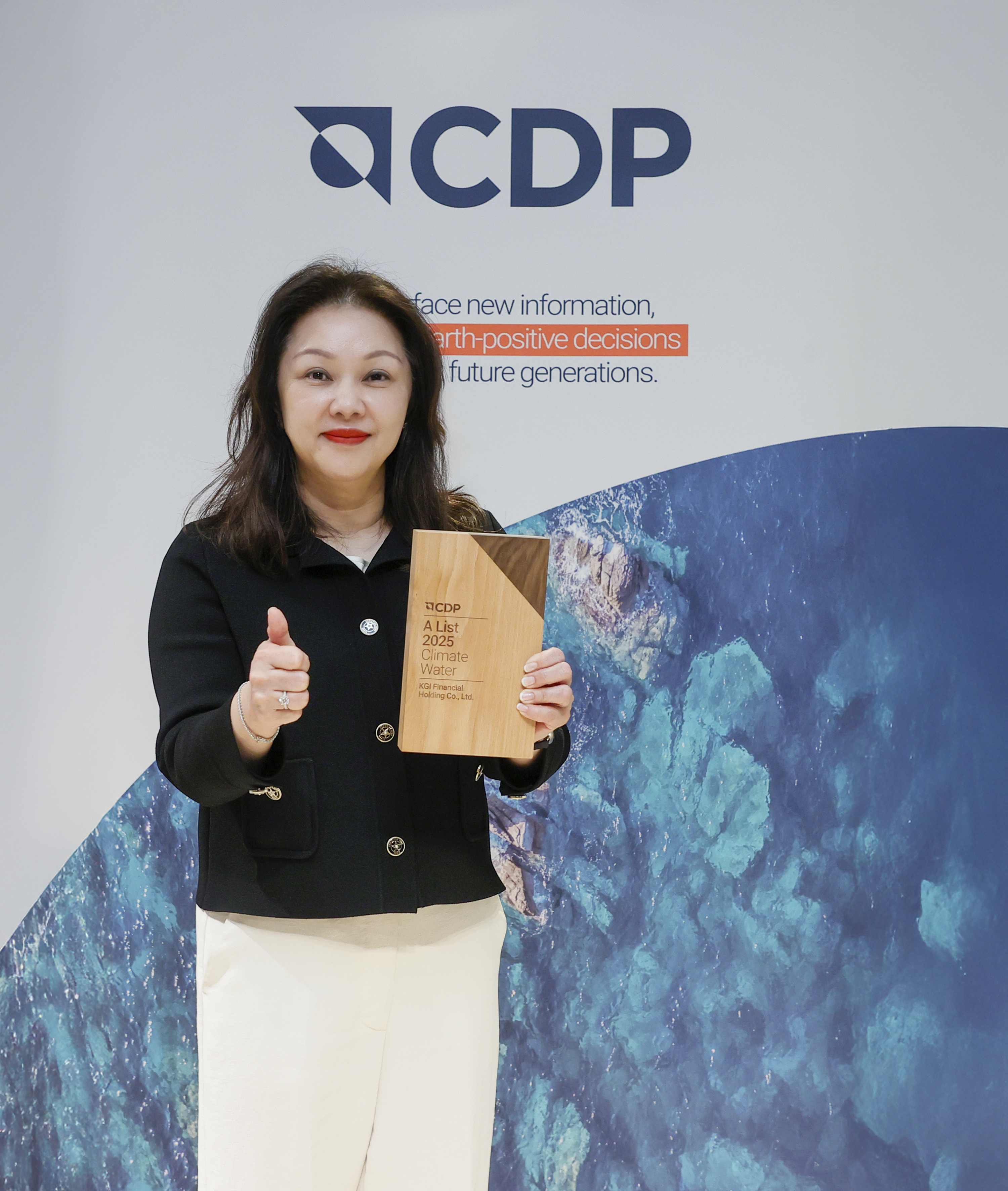 新聞圖說:凱基金控榮獲CDP 三大領域A級最高評等,由凱基金控永續長賴俐臻(右)代表領獎,展現凱基金控在氣候治理與永續發展的卓越成果。